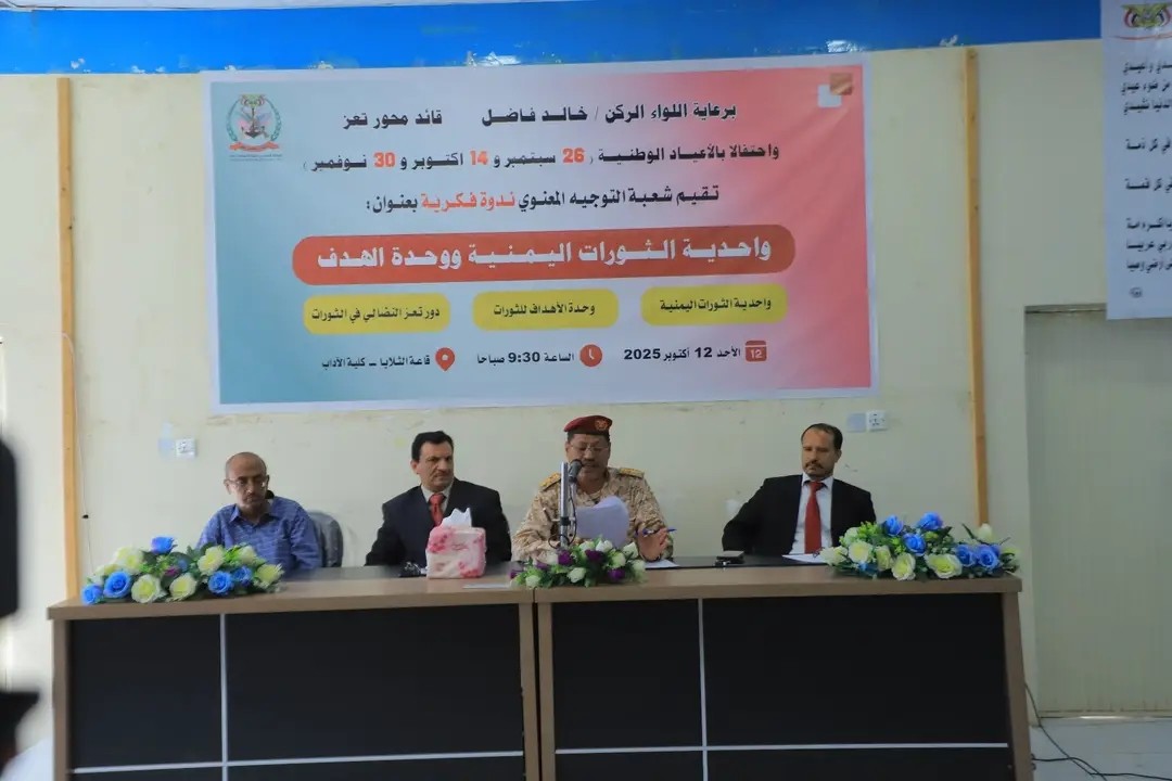 تواصلت في قيادة محور تعز الفعاليات الاحتفالية ابتهاجاً بأعياد الثورة اليمنية المجيدة، حيث نظمت شعبة التوجيه المعنوي، الأحد، ندوة فكرية بعنوان «واحدية الثورات اليمنية»، أحياها نخبة