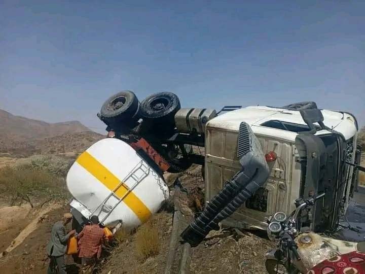 حادث انقلاب شاحنة تحمل زيتاً في البيضاء يكشف عن فساد مليشيا الحوثي