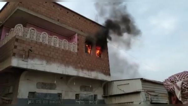 قصف حوثي يشعل حريقا في منزل مواطن بحيس (فيديو)