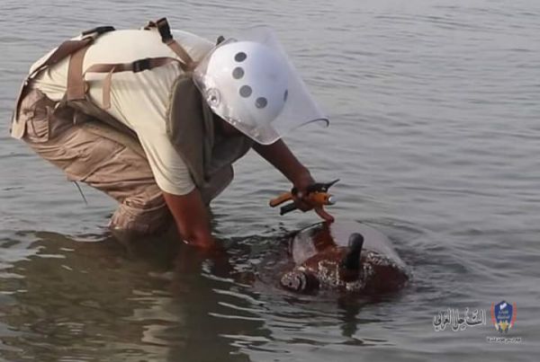مسام يفكك ويفجِّر لغماً بحرياً لمليشيات الحوثي وصل إلى ساحل الخوخة (صور)