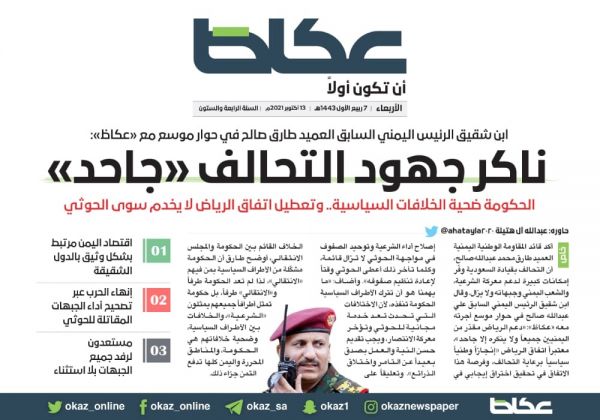 في لقاء صحفي تنشره عكاظ السعودية الخميس 14 أكتوبر.. قائد المقاومة الوطنية رئيس المكتب السياسي العميد الركن طارق محمد عبدالله صالح، يتحدث عن اتفاق الرياض