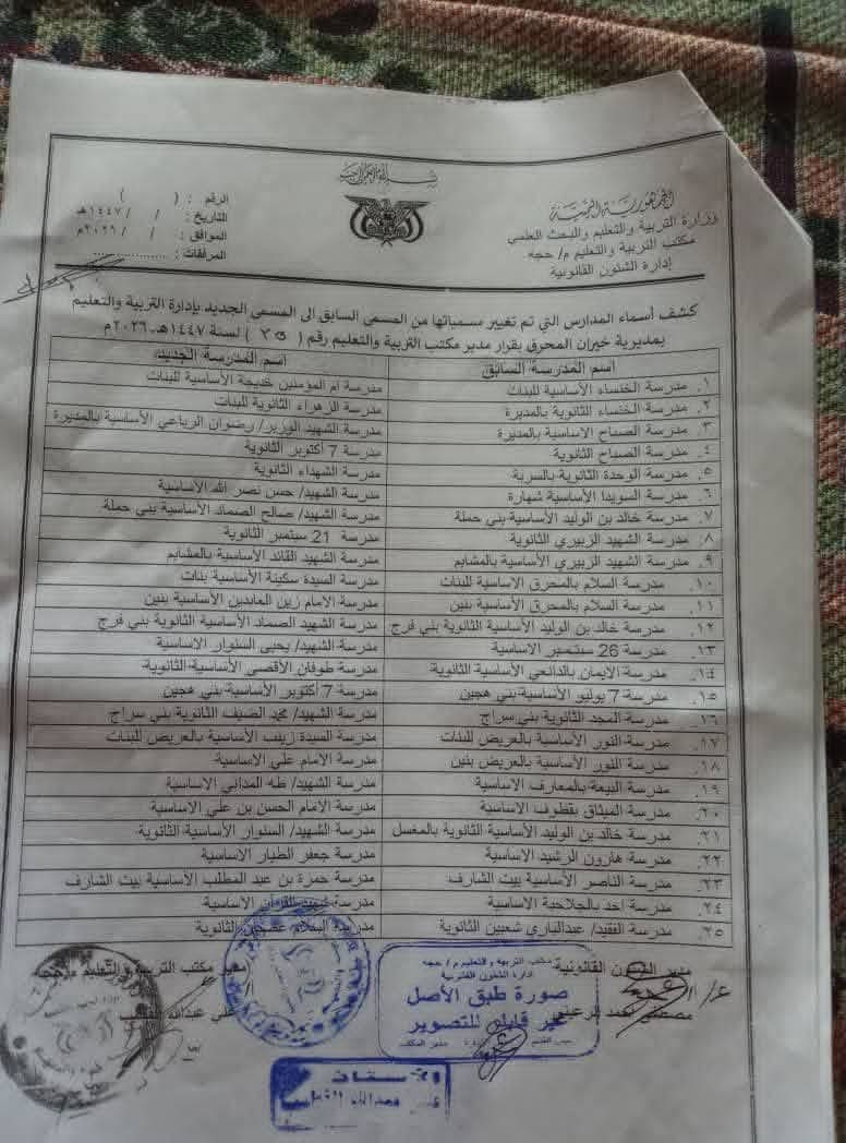 أقدمت مليشيا الحوثي على تنفيذ حملة جديدة استهدفت القطاع التعليمي في محافظة حجة، تمثلت في تغيير أسماء 25 مدرسة حكومية في مديرية خيران المحرق، في خطوة