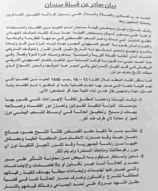 أصدرت قبيلة سنحان بياناً رسمياً يؤكد موقفها الحازم تجاه القضايا الأمنية والقضائية التي تمس أبناء القبيلة، مشددة على دعمها الكامل لتطبيق القانون وتنفيذ الأحكام القضائية المعطلة،