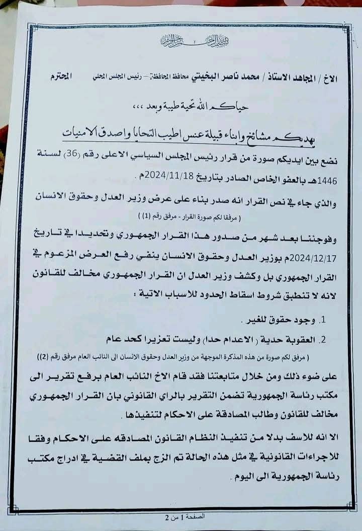 سنحان تطالب بتسريع تنفيذ الأحكام القضائية وتطبيق القصاص في قضايا القتل (وثيقة)