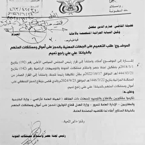 أصدرت مليشيا الحوثي عبر ما يُسمى الحارس القضائي صالح دبيش، قراراً بمصادرة ممتلكات الشيخ القبلي علي بن علي راجح تميم، أحد أبرز وجاهات قبيلة بني صريم
