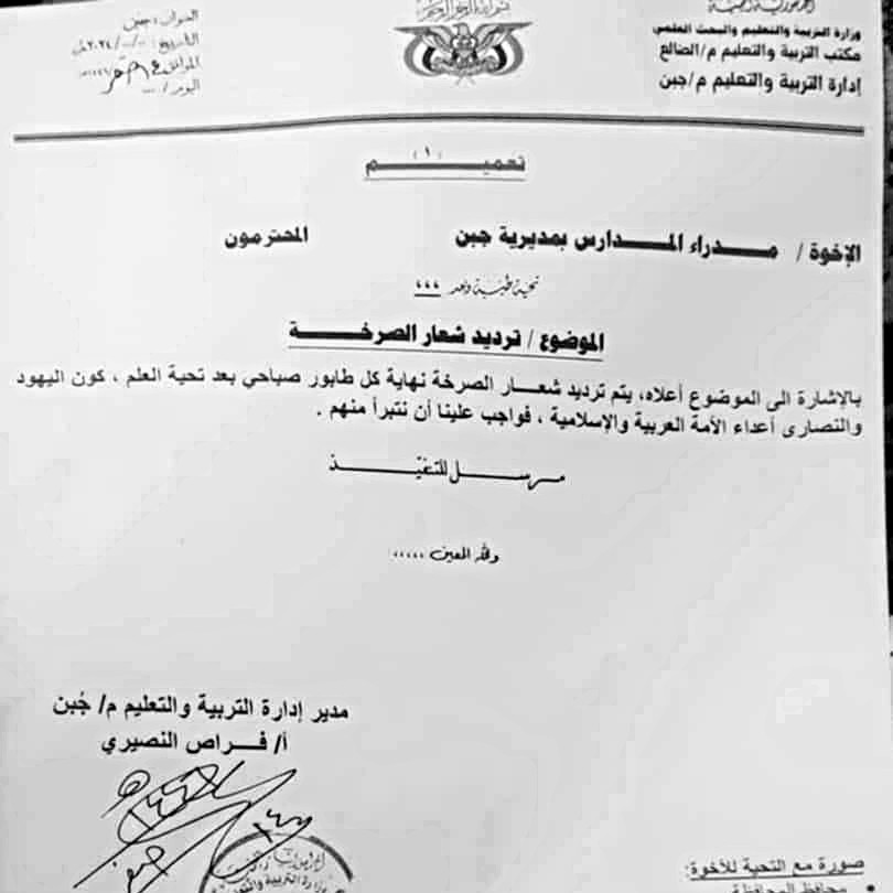 وجهت مليشيا الحوثي مدارس مديرية جُبن في محافظة الضالع بترديد "الصرخة الخمينية" في الطابور الصباحي المدرسي يوميًا، بعد تحية العلم. تأتي هذه الخطوة كجزء من