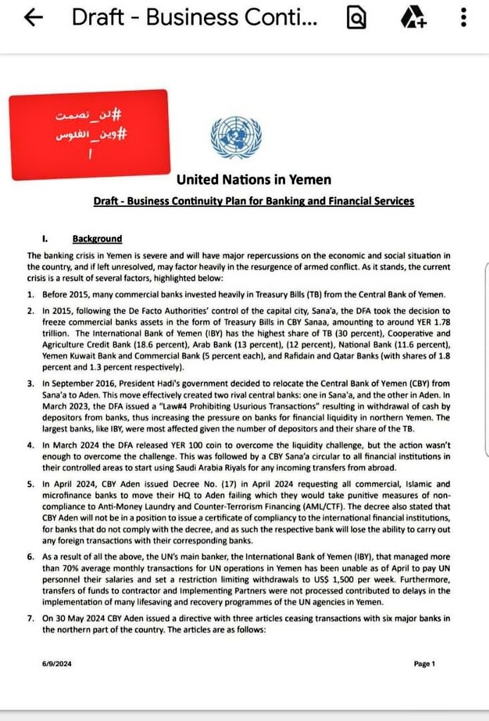 أعلنت الأمم المتحدة عن نيتها تجاوز قرارات البنك المركزي اليمني في عدن، وإدخال العملات الصعبة إلى مناطق سيطرة الحوثيين عبر الطيران؛ نشر الدكتور عبدالقادر الخراز وثيقة