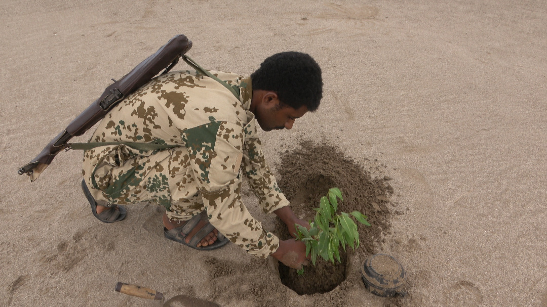 ● الفريق الهندسي نزع وفكك عشرات الألغام وزرع مكانها شتلات أشجار