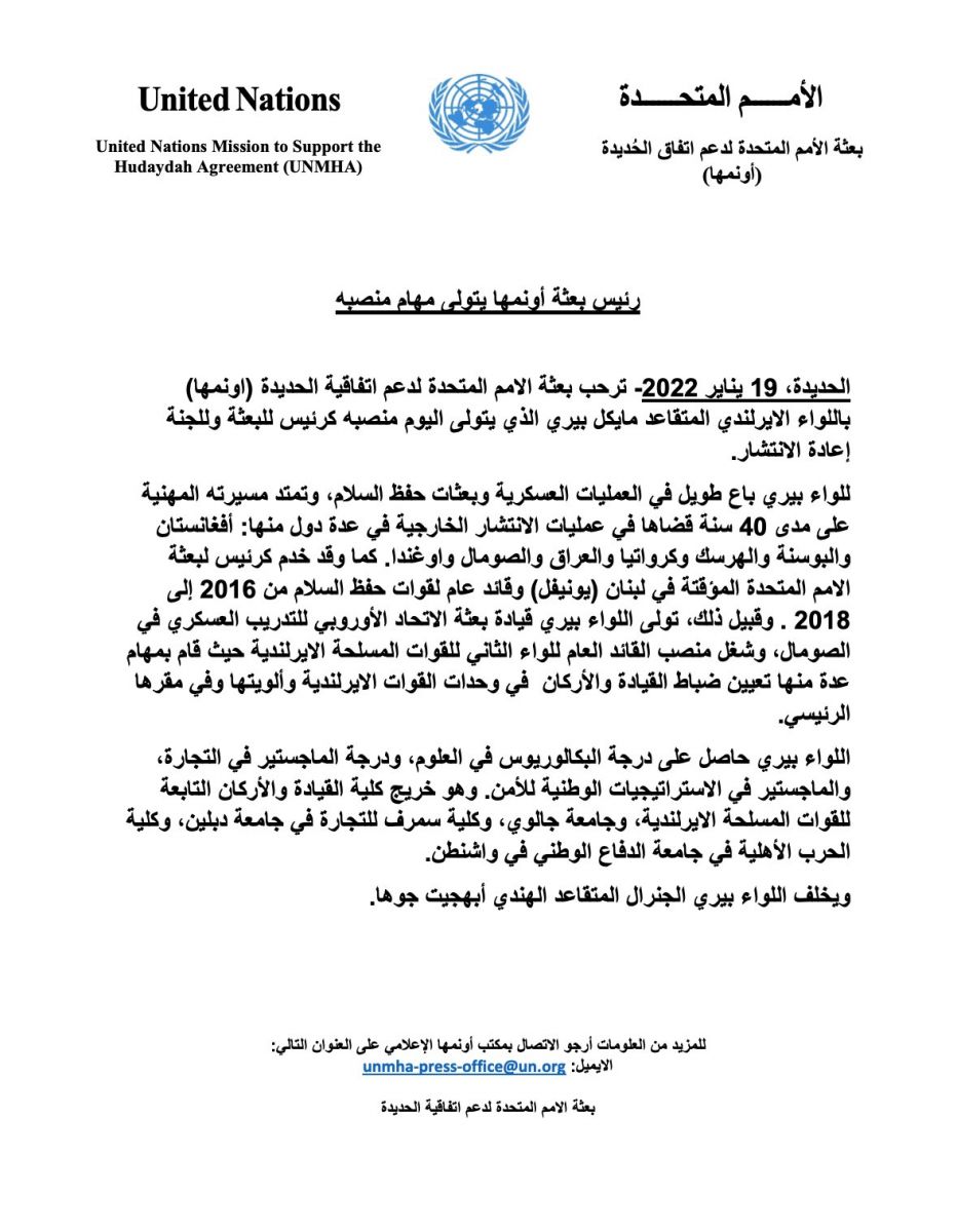 يتولى الجنرال الأيرلندي مايكل بيري مهامه رسميا كرابع رئيس لبعثة الحديدة ولجنة تنسيق إعادة الإنتشار، خلفا للجنرال الهندي أبيهجيت جوها الذي انتهت ولايته في مطلع أكتوبر/ تشرين الأول 2021.