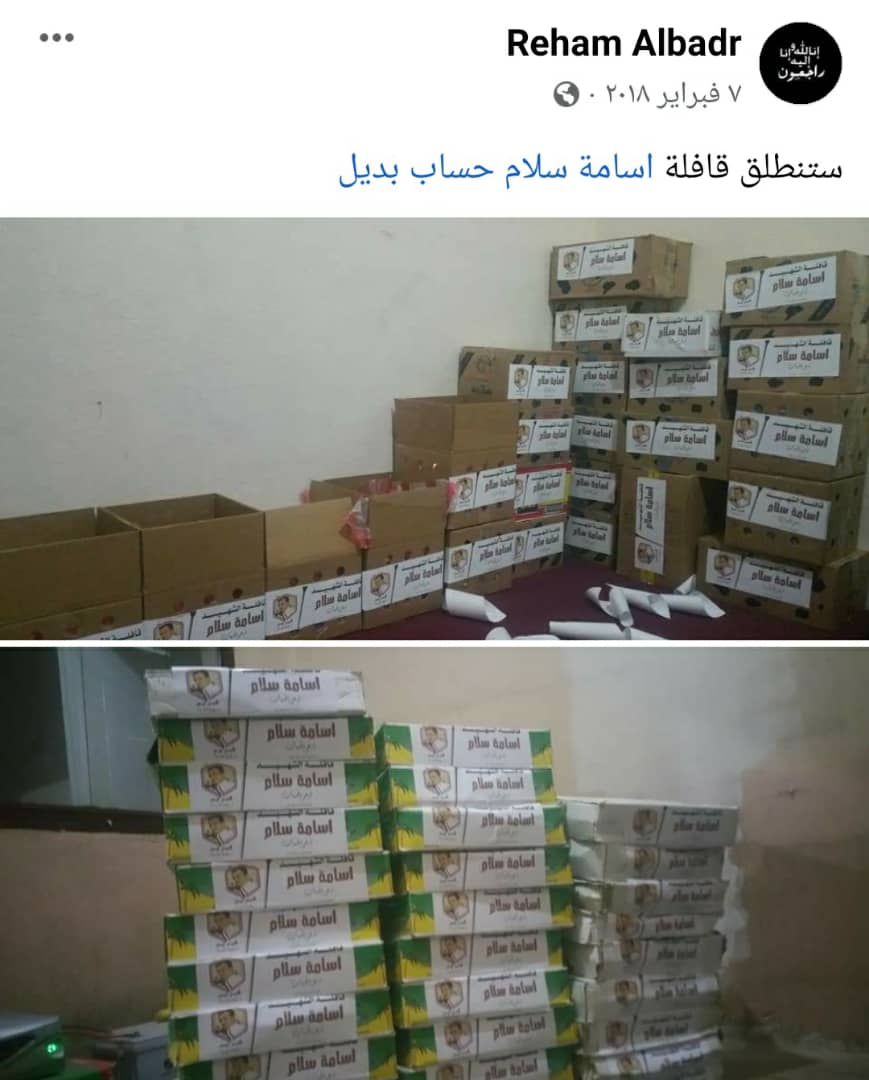 الثامن من فبراير 2018، كان "أسامة سلام" اسمًا لقافلة إنسانية بعد أن فارق روحه بأيام، إثر قذيفة سقطت دون إنذار أثناء توزيعه سللاً غذائية في التشريفات، شمال المدينة.. الثامنة صباحًا، الفريق يتوسط شارع جمال -جوار مبنى اللجنة الوطنية- بقافلته الغذائية والعلاجية تحمل اسم زميلهم.. مكان النزول "أبعر" ضمن مناطق "صالة".