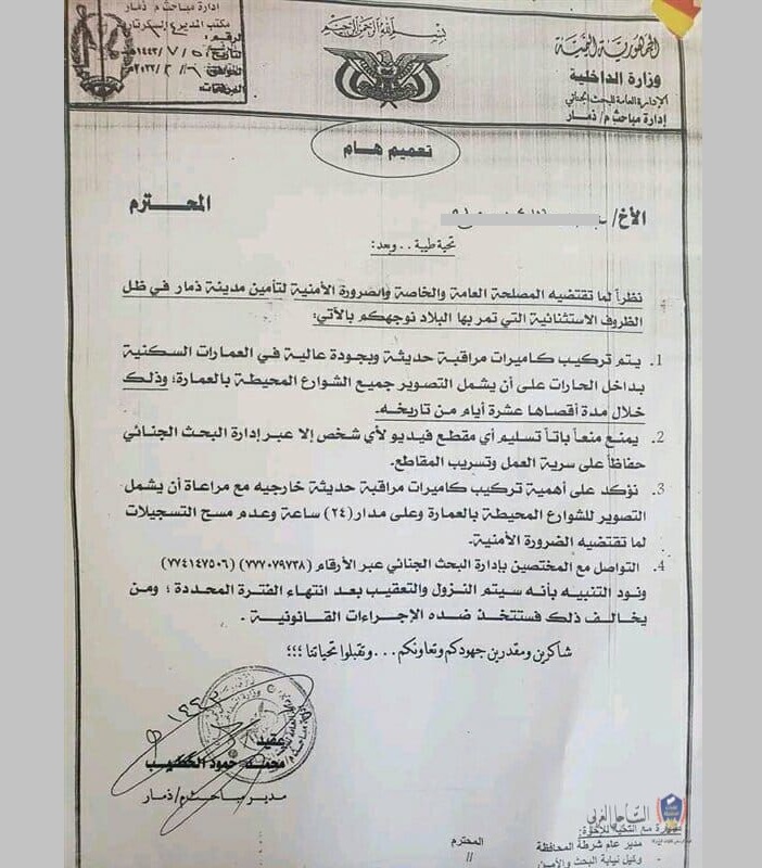 "راقبوكم لصالحنا".. تعميم حوثي في ذمار يفرض "كاميرات مراقبة خارجية" على المنازل (وثيقة)