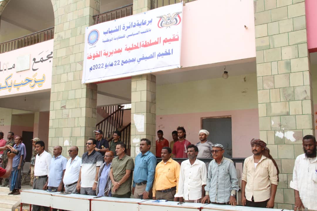 دشّنت السلطة المحلية في مدينة الخوخة العاصمة المؤقتة لمحافظة الحديدة جنوب محافظة الحديدة، الأربعاء 22 يونيو 2022م، المخيم الصيفي، الذي يُقام برعاية المكتب السياسي للمقاومة الوطنية في مجمع الثاني والعشرين من مايو.