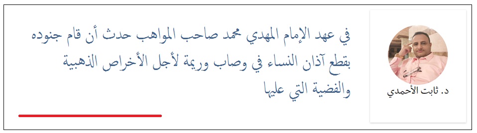وفي عهد الإمام المهدي محمد صاحب المواهب حدث أن قام جنوده بقطع آذان النساء في وصاب وريمة لأجل الأخراص الذهبية والفضية التي عليها. انظر: اليمن في ظل حكم الإمَام المهدي، د. محمد علي دبي الشهاري، ص: 237.