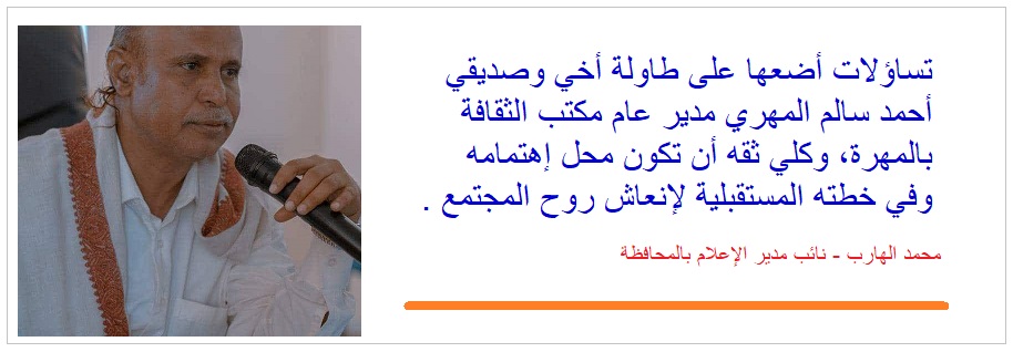 جلست مكاني أتأمل في هذه العبارات والأسئلة وقررت أن أعطي الخبز لخبازه وأضع كل ماسبق على طاولة أخي وصديقي أحمد سالم المهري مدير عام مكتب الثقافة بالمهرة وكلي ثقه أن تكون هذه التساؤلات محل إهتمامه وفي خطته المستقبلية لإنعاش روح المجتمع .