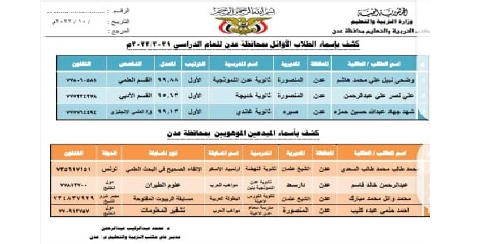 محافظة عدن تكرم المبرزين والمبدعين وأوائل الثانوية (أسماء وصر)
