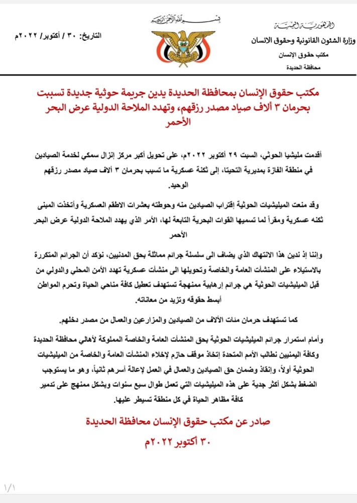 مكتب حقوق الإنسان بمحافظة الحديدة يدين جريمة حوثية جديدة تسببت بحرمان 3 ألاف صياد مصدر رزقهم، وتهدد الملاحة الدولية عرض البحر الأحمر