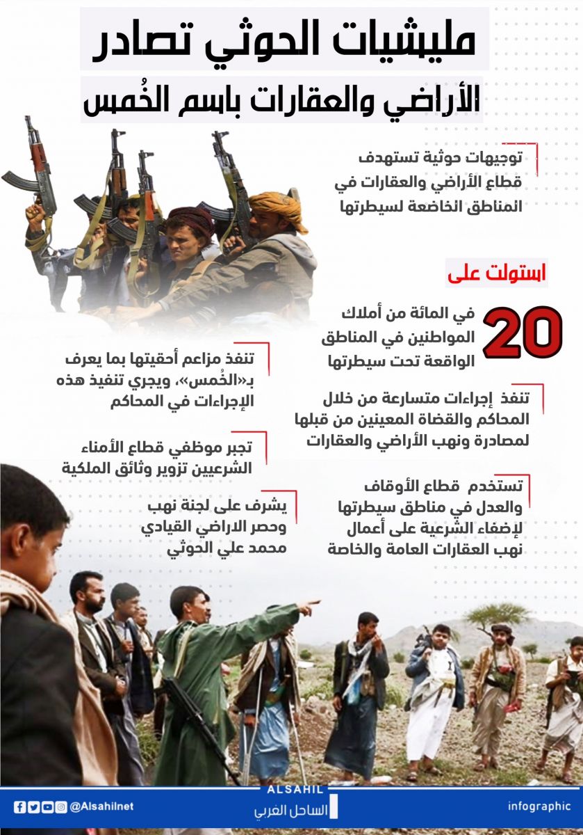 إلى جانب نهب الأراضي والعقارات، بدأت جماعة الحوثي في اليمن الاستيلاء على 20 في المائة من أملاك المواطنين في المناطق الواقعة تحت سيطرتها في محافظة تعز (جنوب غرب) خلال عمليات البيع والشراء، تنفيذاً لمزاعم أحقيتها بما يعرف بـ«الخُمس»، ويجري تنفيذ هذه الإجراءات في المحاكم أو عبر فروع ما يعرف بـ«الهيئة العدلية» التي أنشأها الحوثيون.
