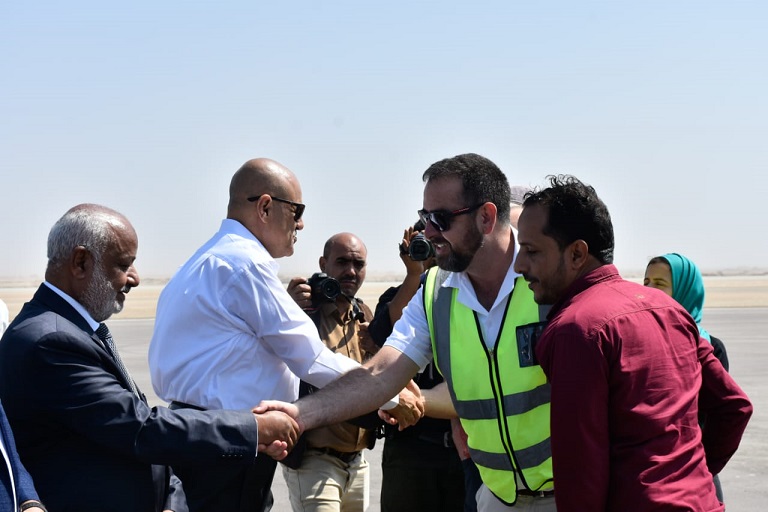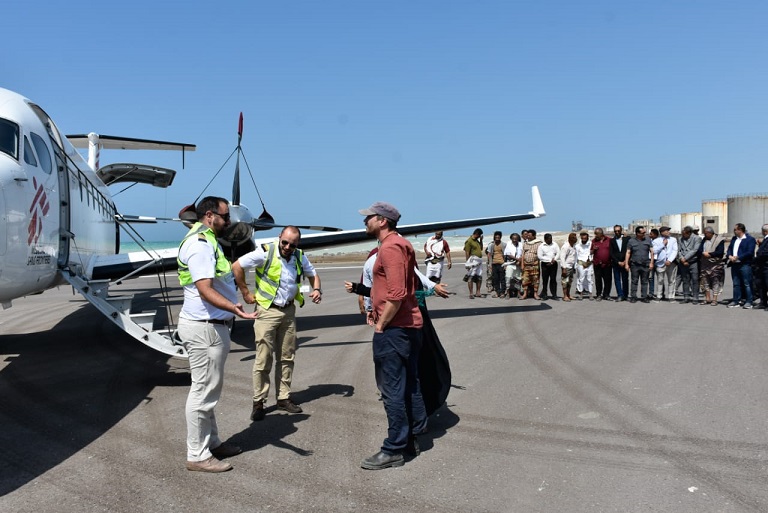 عقب ذلك استقبل محافظ تعز نبيل شمسان وصول أول طائرة تابعة لمنظمة أطباء بلا حدود إلى مطار المخا تعز وعلى متنها وفد المنظمة الأممية.