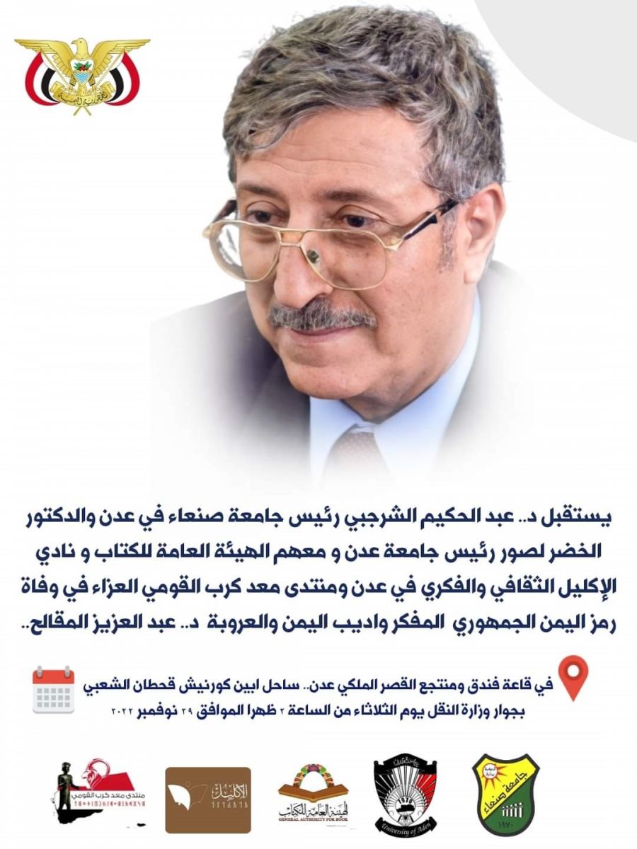 يستقبل الدكتور عبد الحكيم الشرجبي رئيس جامعة صنعاء والدكتور الخضر لصور رئيس جامعة عدن والهيئة العامة للكتاب ونادي الإكليل الثقافي والفكري ومنتدى معد كرب القومي العزاء في وفاة رمز اليمن الجمهوري المفكر وأديب اليمن والعروبة الفقيد الدكتور عبد العزيز المقالح، في العاصمة المؤقتة عدن.