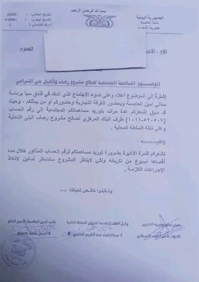 ووفقاً لمذكرة من سلطة مليشيا الحوثي تتطالب التجار بدفع إتاوات مالية مقابل إصلاح الشوارع والبنى التحتية في العاصمة صنعاء المحتلة.