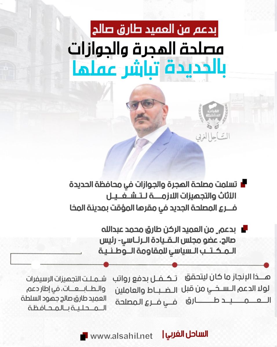 تسلّمت مصلحة الهجرة والجوازات في محافظة الحديدة، الثلاثاء 24 يناير/ كانون الثاني 2023، الأثاث والتجهيزات اللازمة لتشغيل فرع المصلحة الجديد في مقرها المؤقت بمدينة المخا، وذلك بدعمٍ من العميد الركن طارق محمد عبدالله صالح، عضو مجلس القيادة الرئاسي- رئيس المكتب السياسي للمقاومة الوطنية.