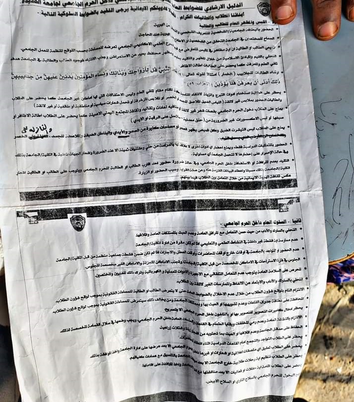 وتداول ناشطون على مواقع التواصل الاجتماعي منشورا صادرا عن قيادة المليشيا بجامعة الحديدة تحت مسمى "الدليل الارشادي للضوابط العامة لسلوك الطالب الجامعي داخل الحرم الجامعي" والذي قدمت فيه القيادات الحوثية تعليمات واشتراطات للطلاب والطالبات من منتسبي الجامعة للالتزام بها.