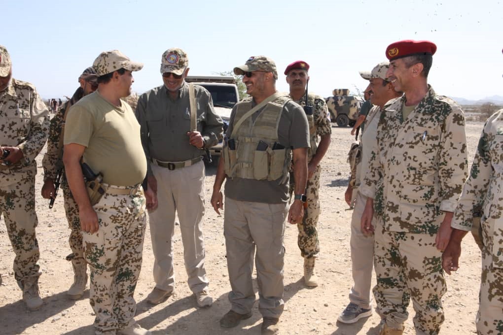 رافقه خلال الزيارة، رئيس عمليات المقاومة الوطنية العميد الركن عبدالرحمن نعمان السامعي، والعميد الركن عدي العماد، قائد اللواء التاسع حراس الجمهورية- عضو اللجنة العسكرية والأمنية.