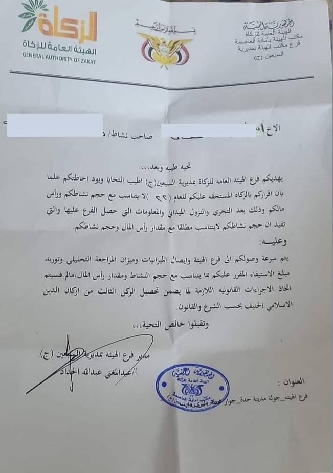 قالت مصادر مطلعة للساحل الغربي، إن قيادة المليشيا في فرع ما تسمى "الهيئة العامة للزكاة" بمديرية السبعين (ج) بصنعاء وزعت على التجار مذكرات استدعاء تطالبهم بسرعة الحضور إلى مقر الهيئة.