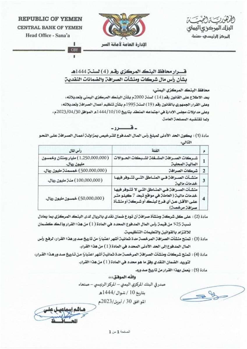 وتضمنت وثيقة قرار صادر عن البنك المركزي الخاضع للانقلابيين بصنعاء، إلزم شركات منشآت الصرافة المرخصة إيداع ما نسبته 25% من قيمة رأس المال كحد ادنى لديه كضمان نقدي وامهلها توريده خلال مدة 8 أشهر اعتباراً من تاريخ صدور القرار