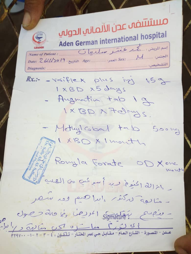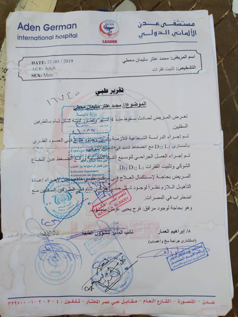 يعاني محمد عنتر من شلل نصفي أقعده عن الحركة بمضاعفات حادث تعرض له في العمود الفقري بينما يعمل في موقع بناء قبل أكثر من عامين، ومنذ ذلك التاريخ خضع لتدخلات جراحية في عدن ولكن تقارير الأطباء تؤكد حاجة محمد لتدخلات ورعاية وإعادة تأهيل في مركز جراحي متخصص خارج اليمن.