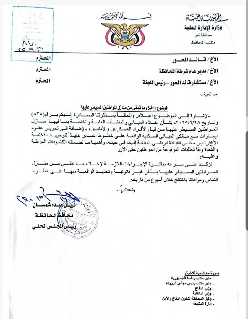تعز.. توجيهات بإخلاء المنازل والمنشآت المسيطر عليها خارج القانون خلال أسبوع